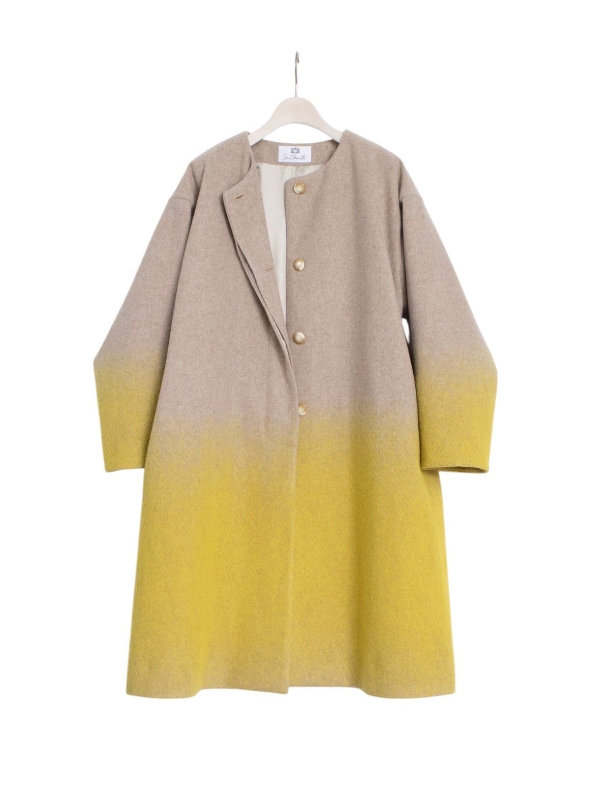 ラムウールを使用したメルトン素材のノーカラーロングコート。