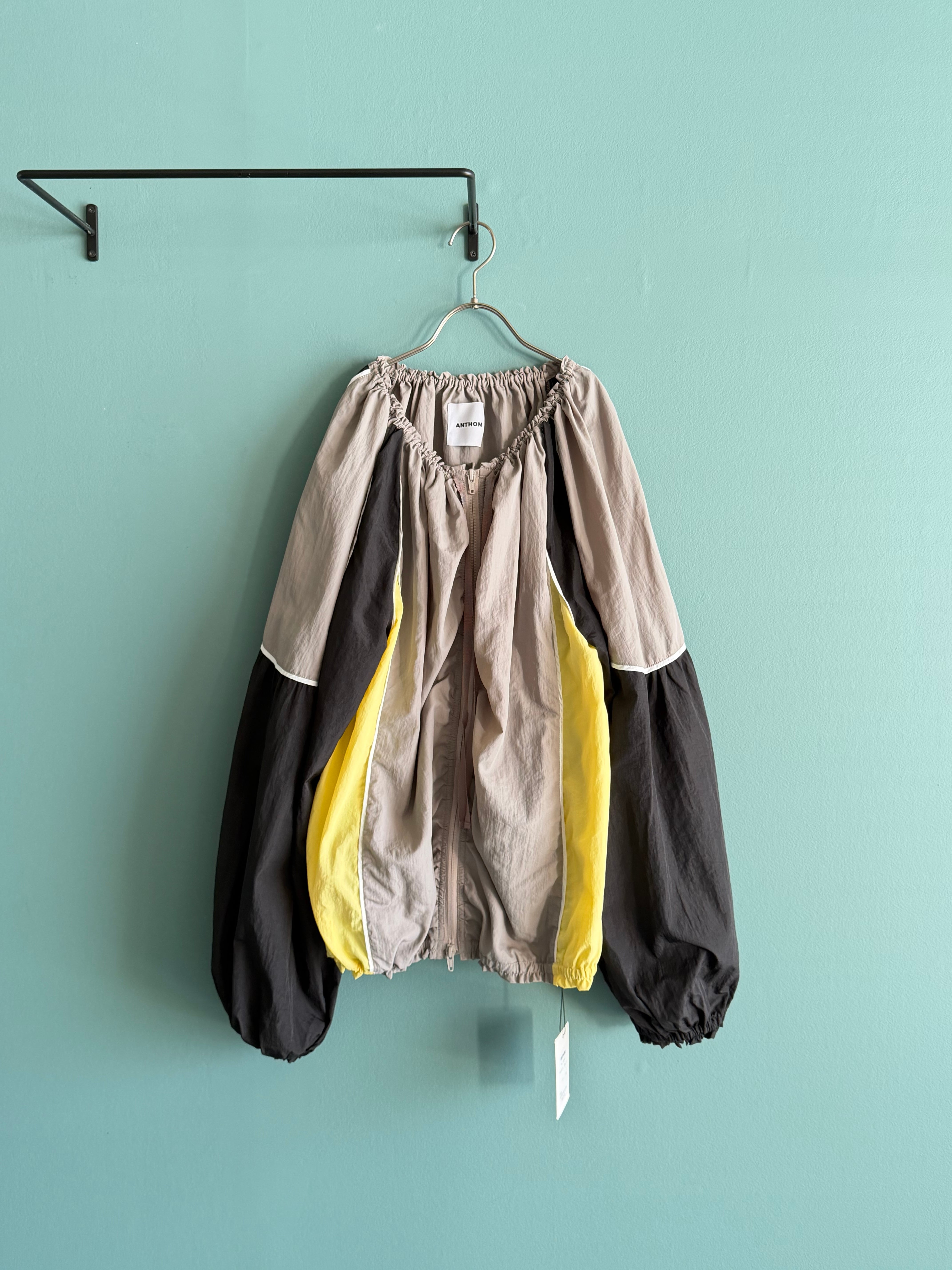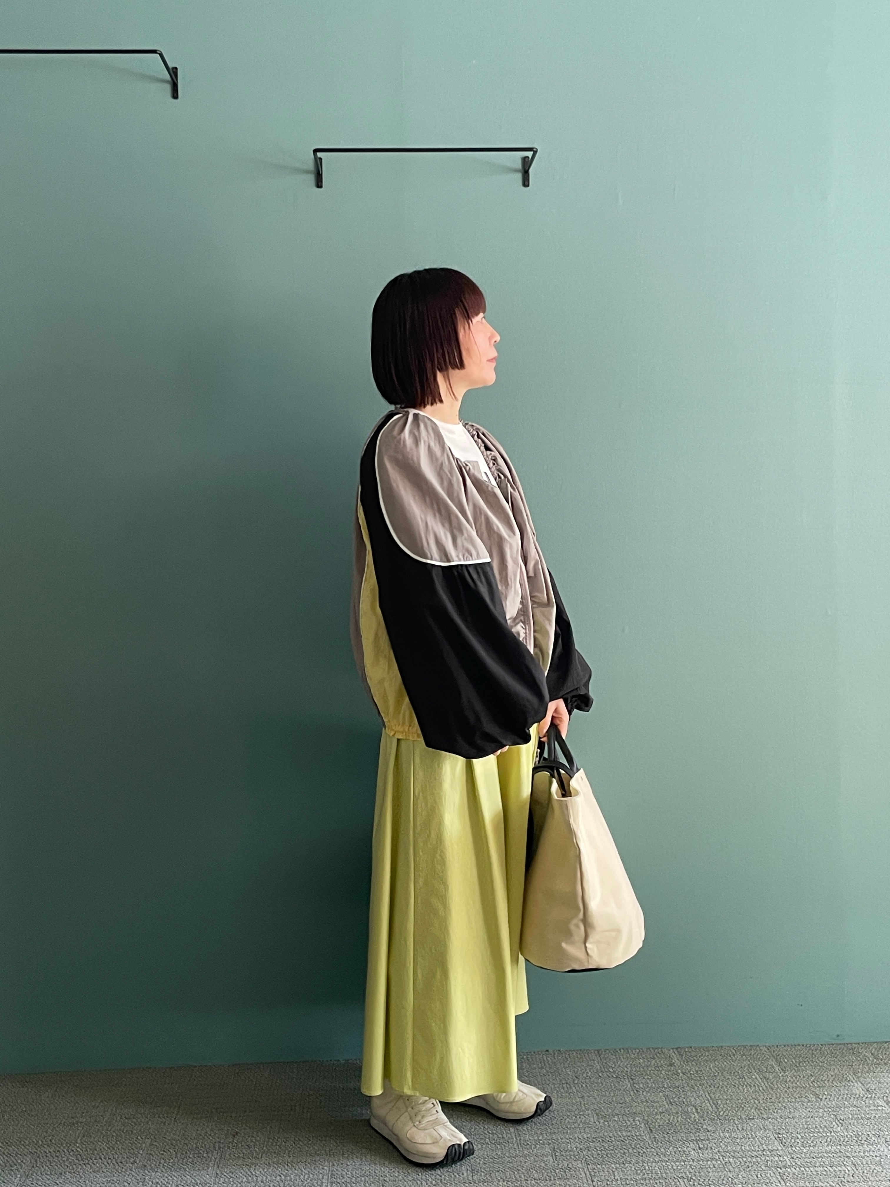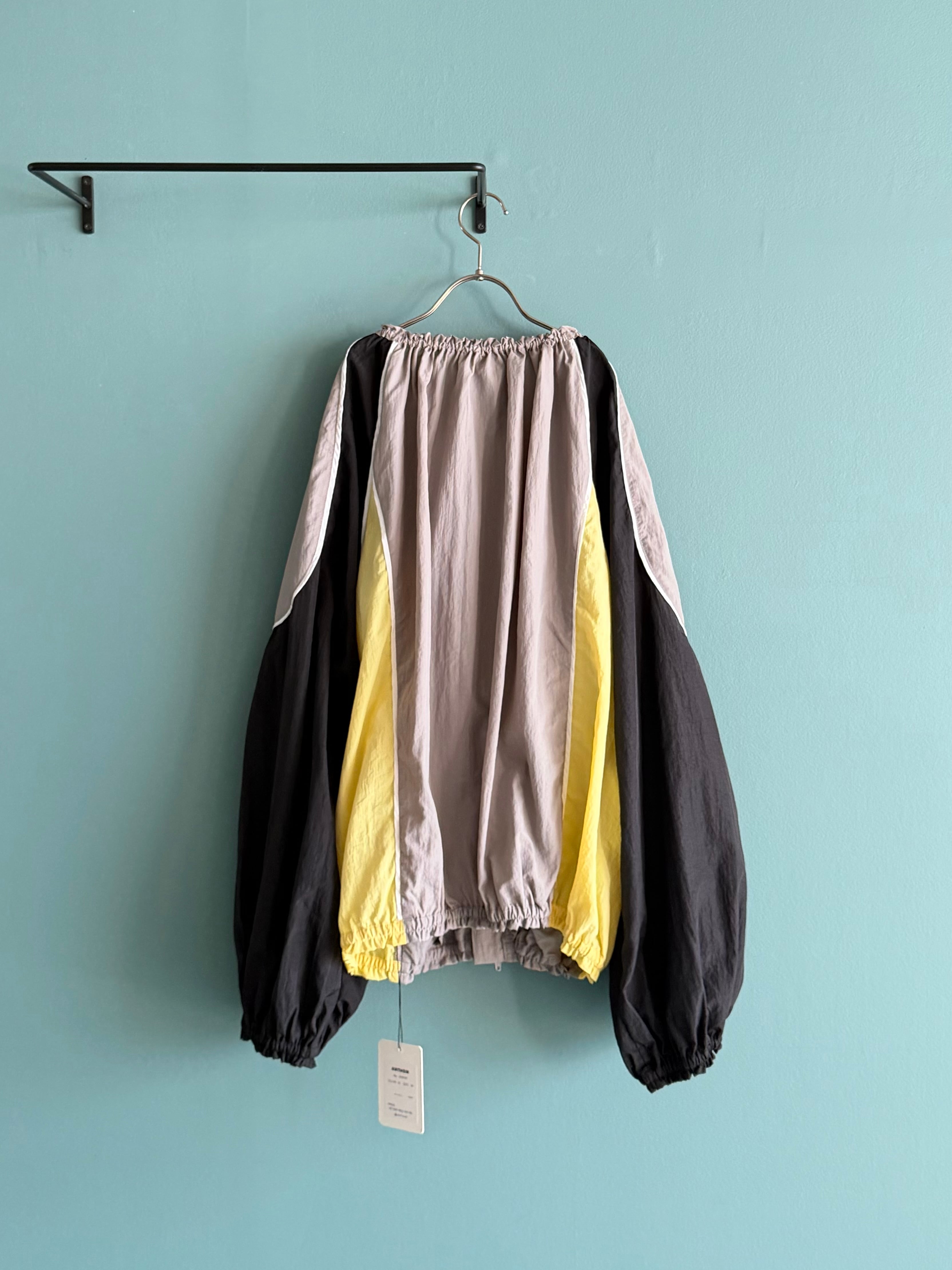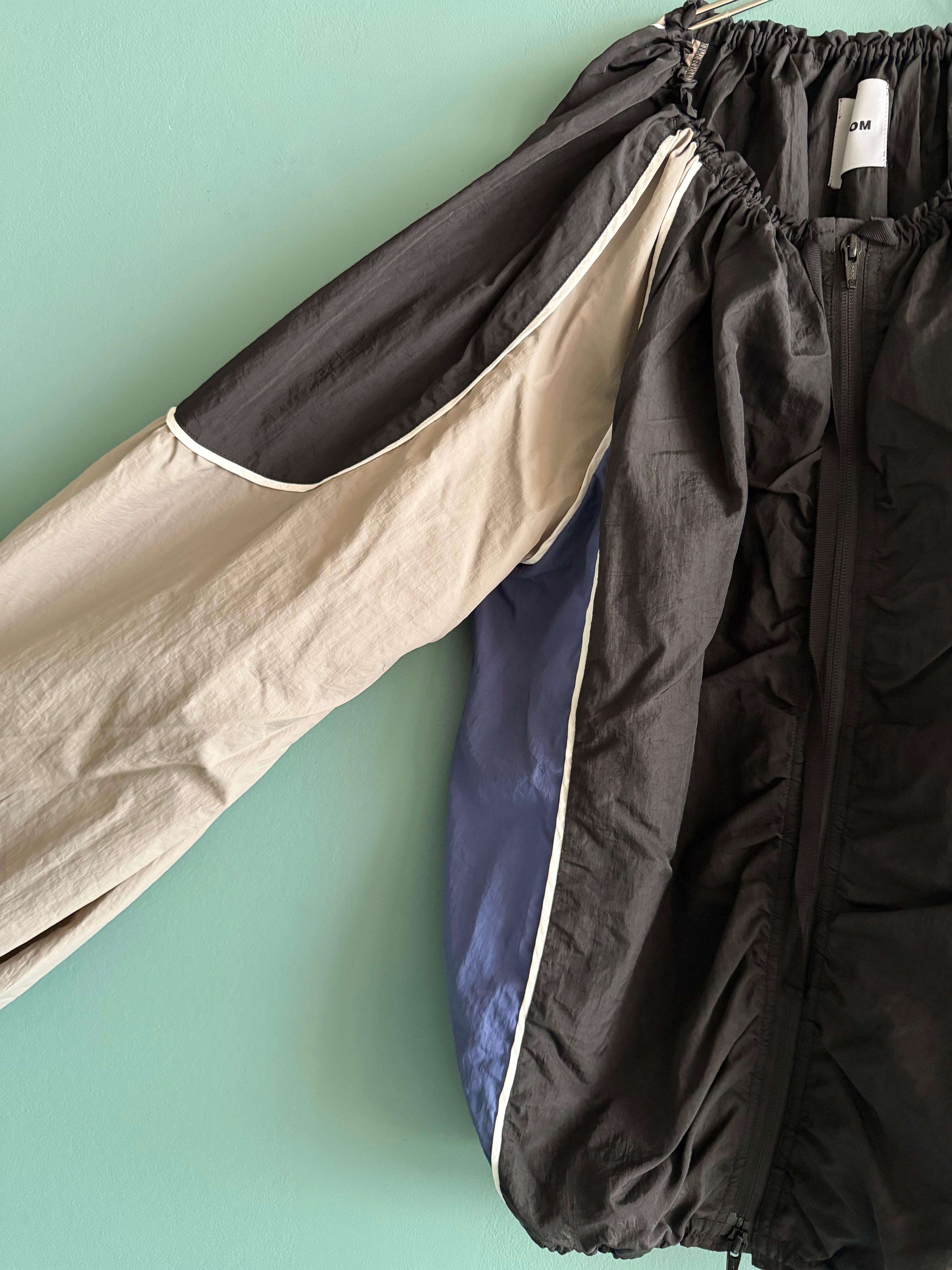 軽やかなナイロン素材に、たっぷりと寄せたギャザーと配色切り替えが映える主役級ブルゾン。