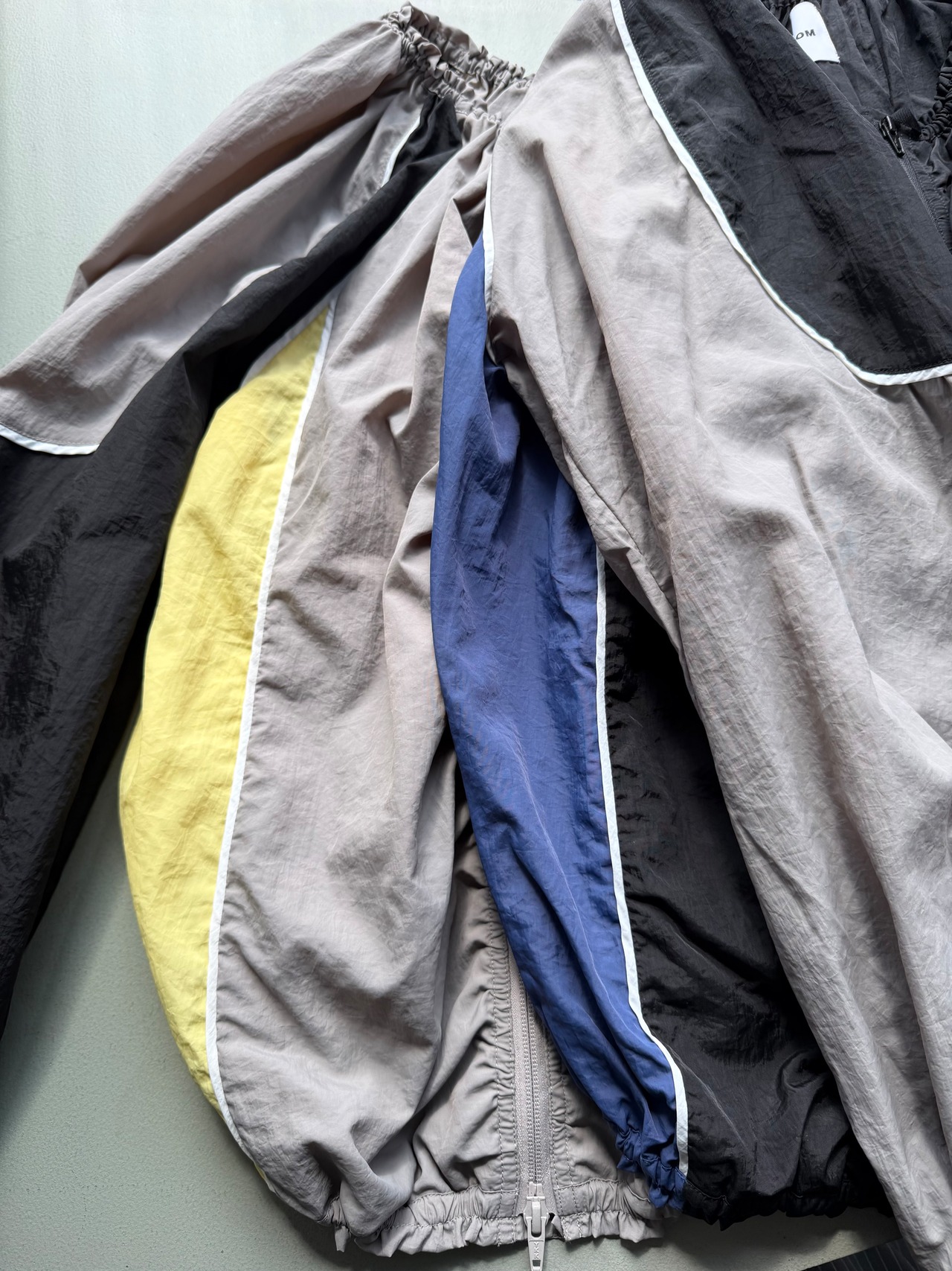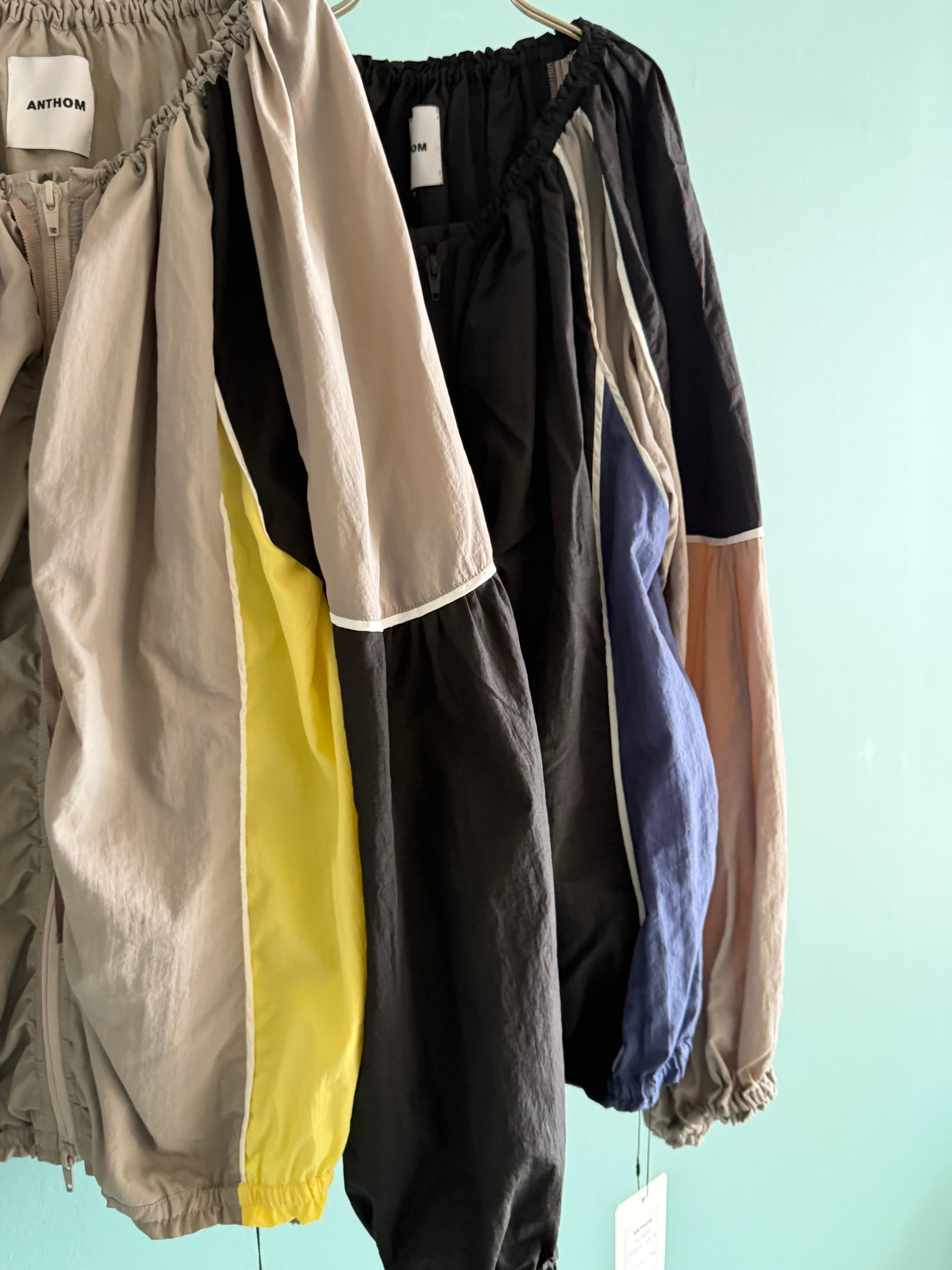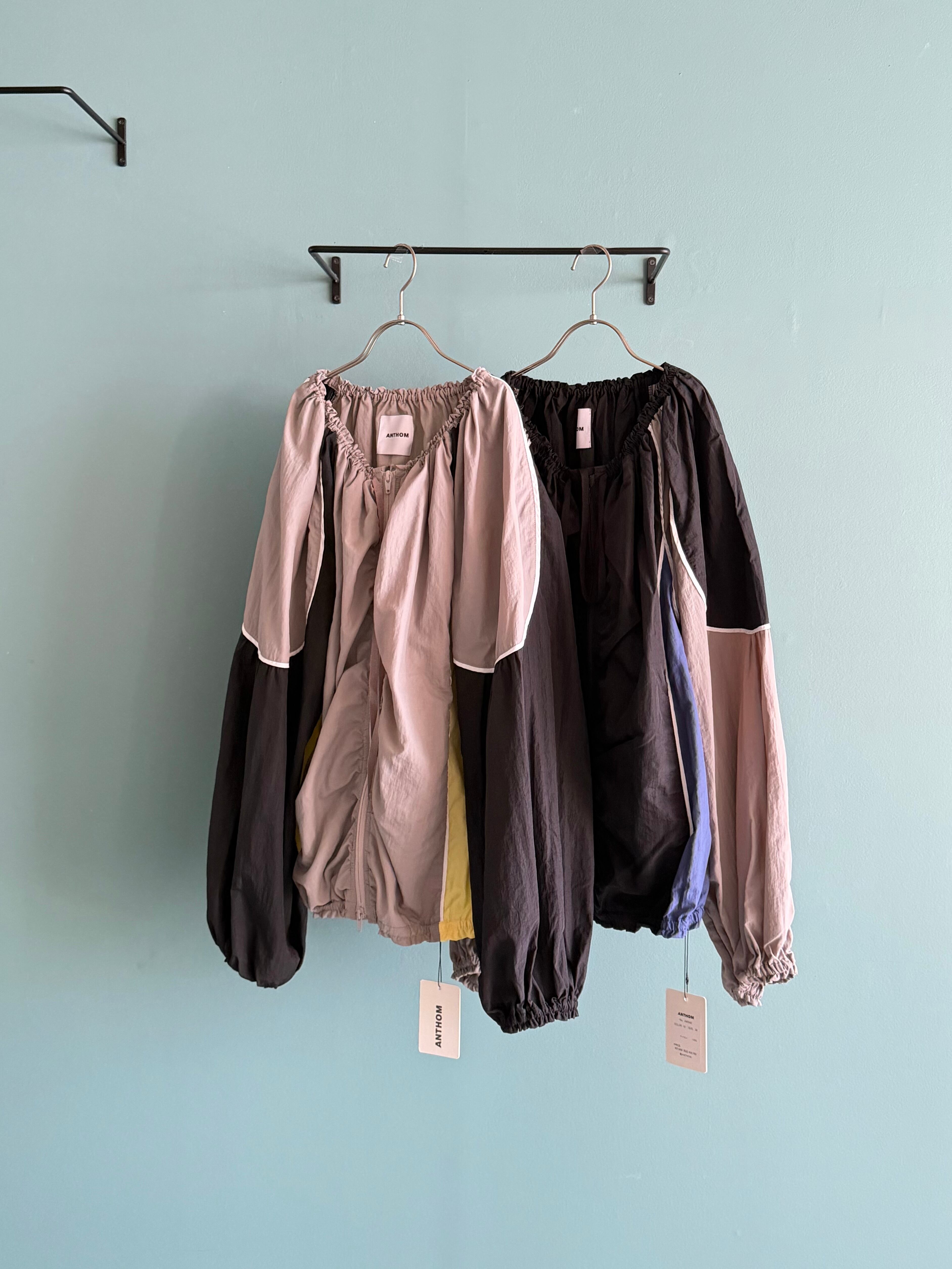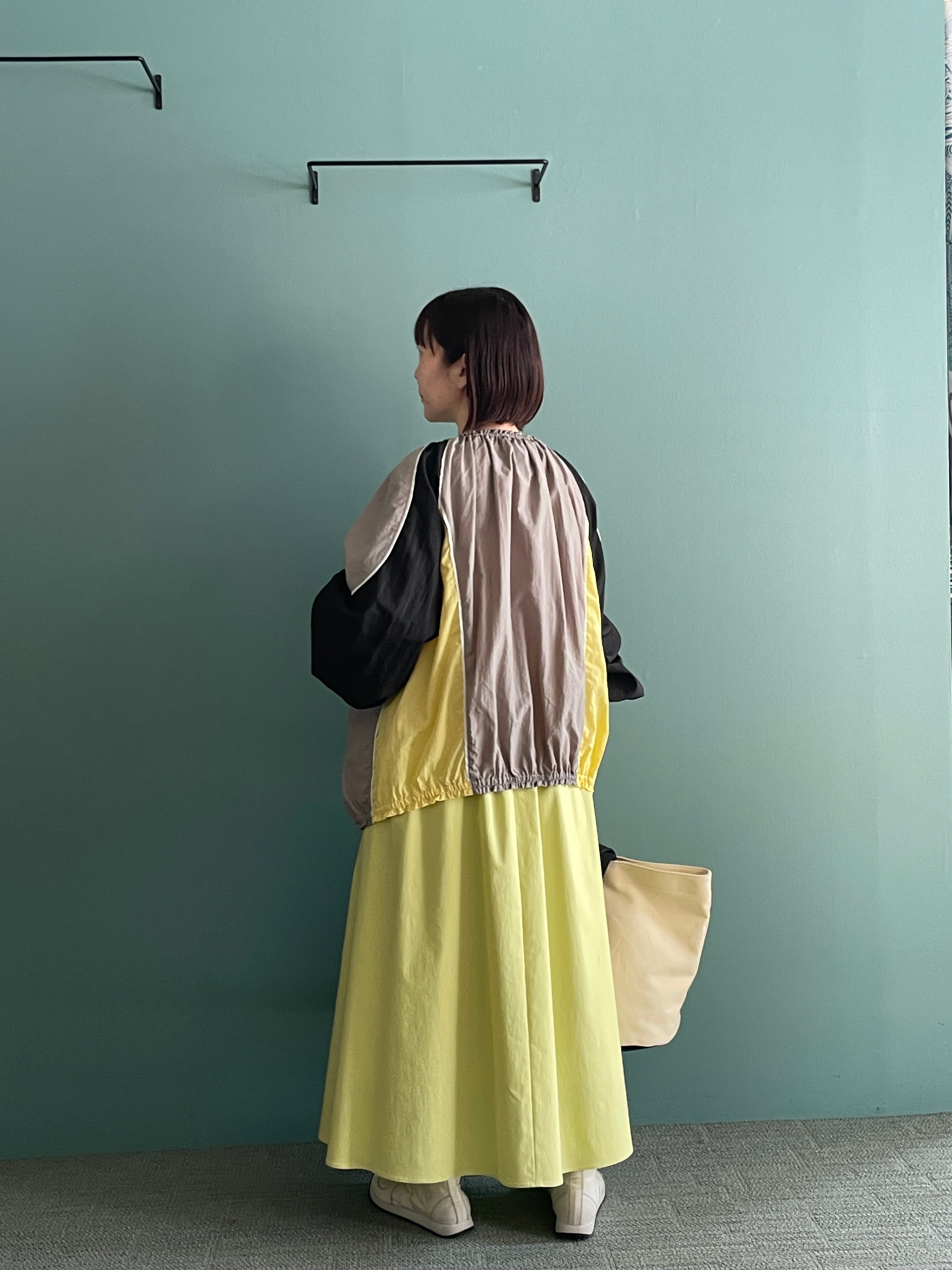 軽やかなナイロン素材に、たっぷりと寄せたギャザーと配色切り替えが映える主役級ブルゾン。
