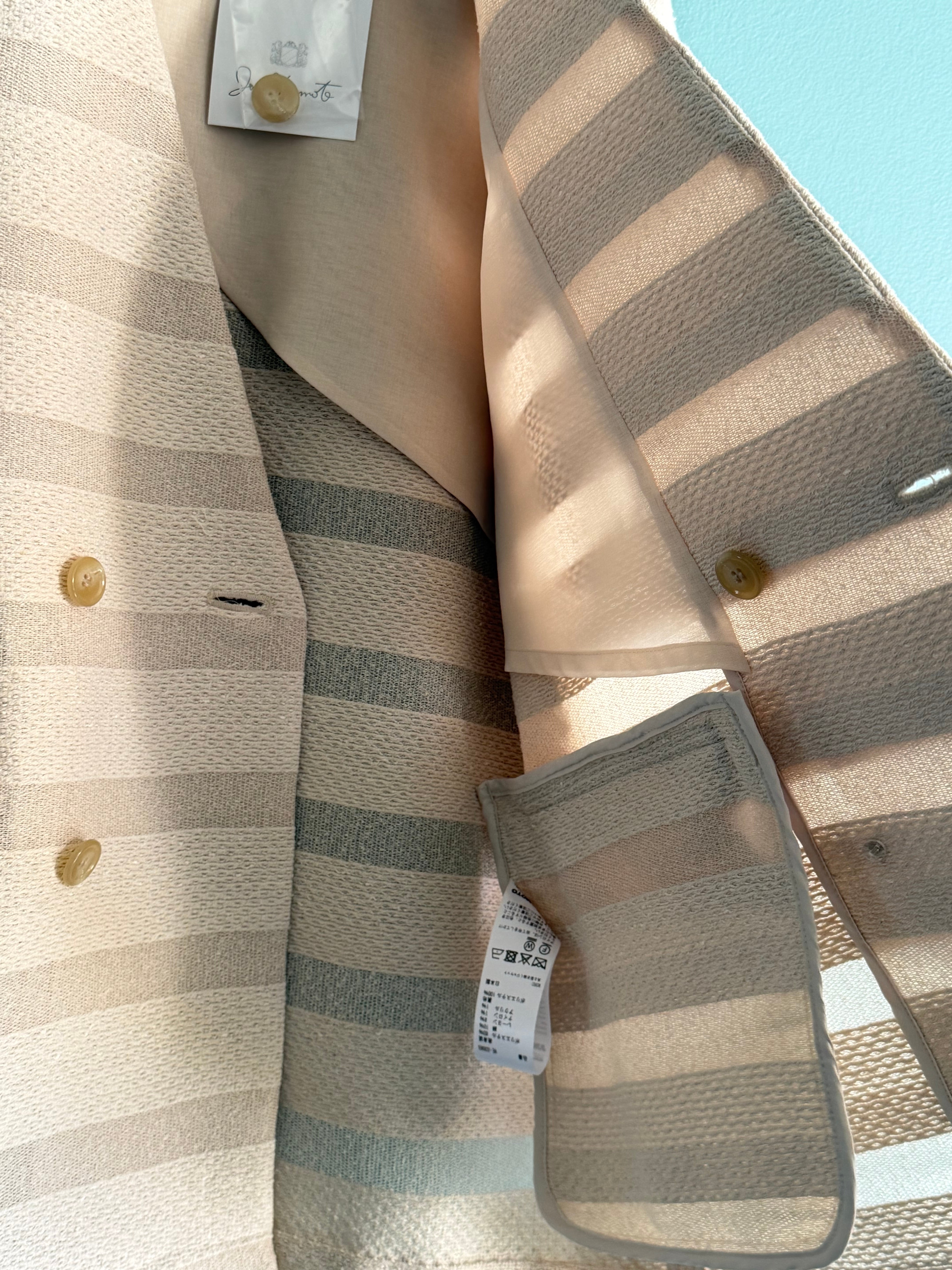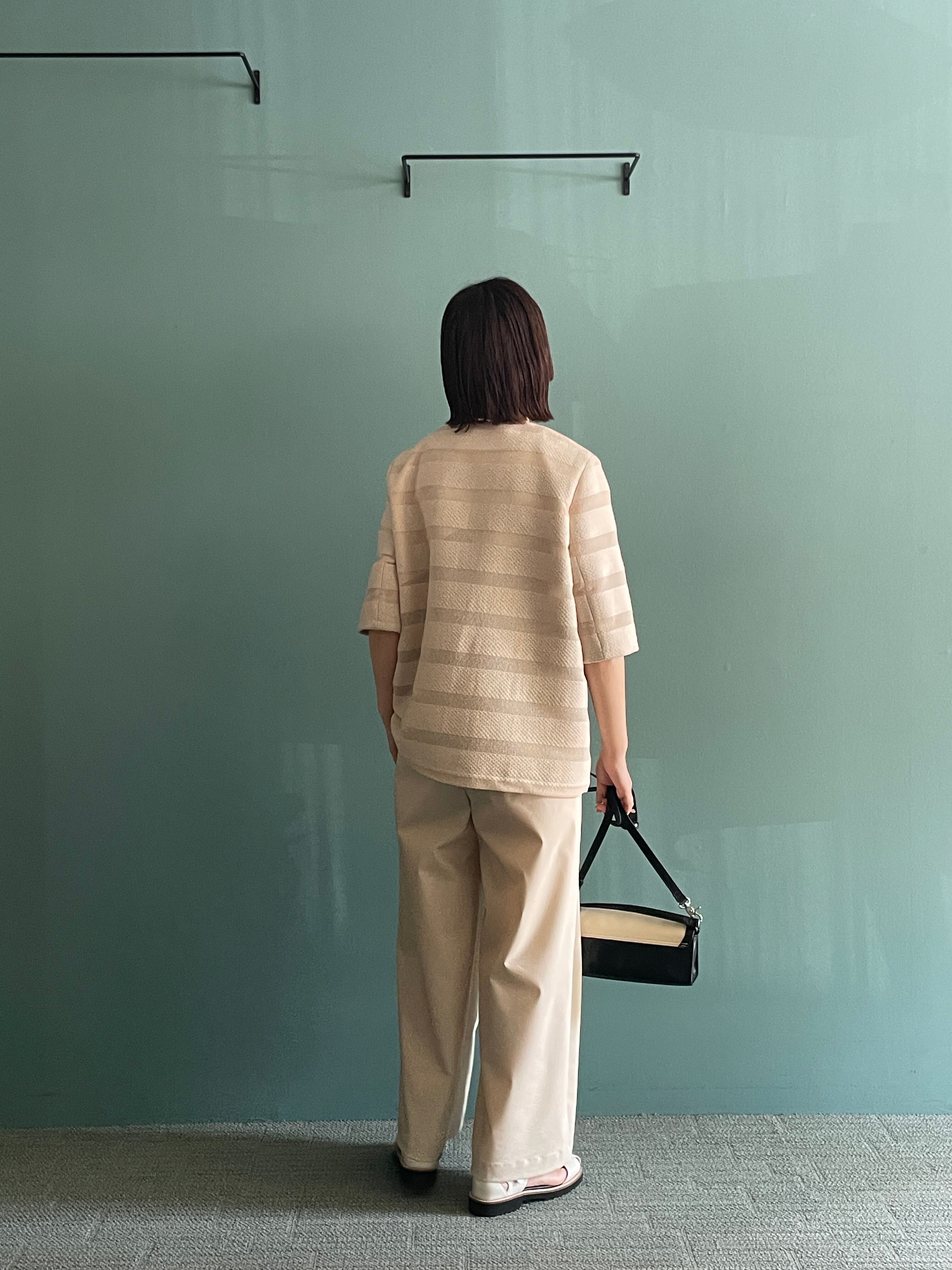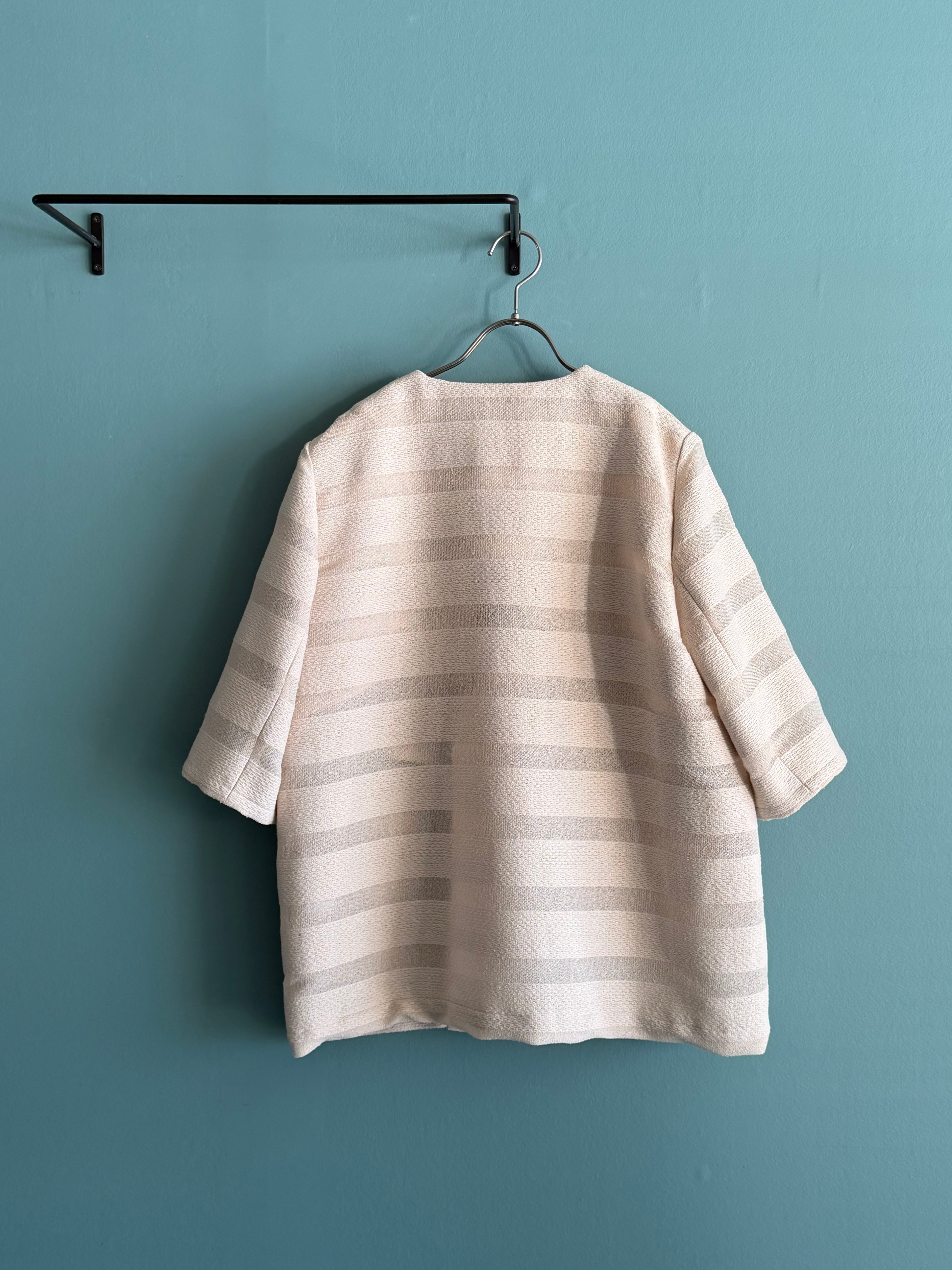 カラミ素材とツィード調素材を交互に織り重ねることで、光を透かし影を刻むようなボーダー柄を描いたノーカラージャケット。