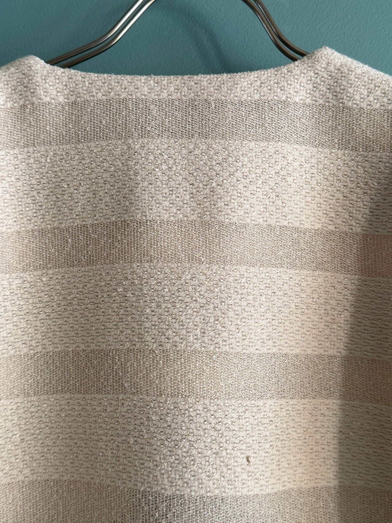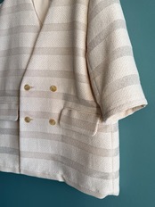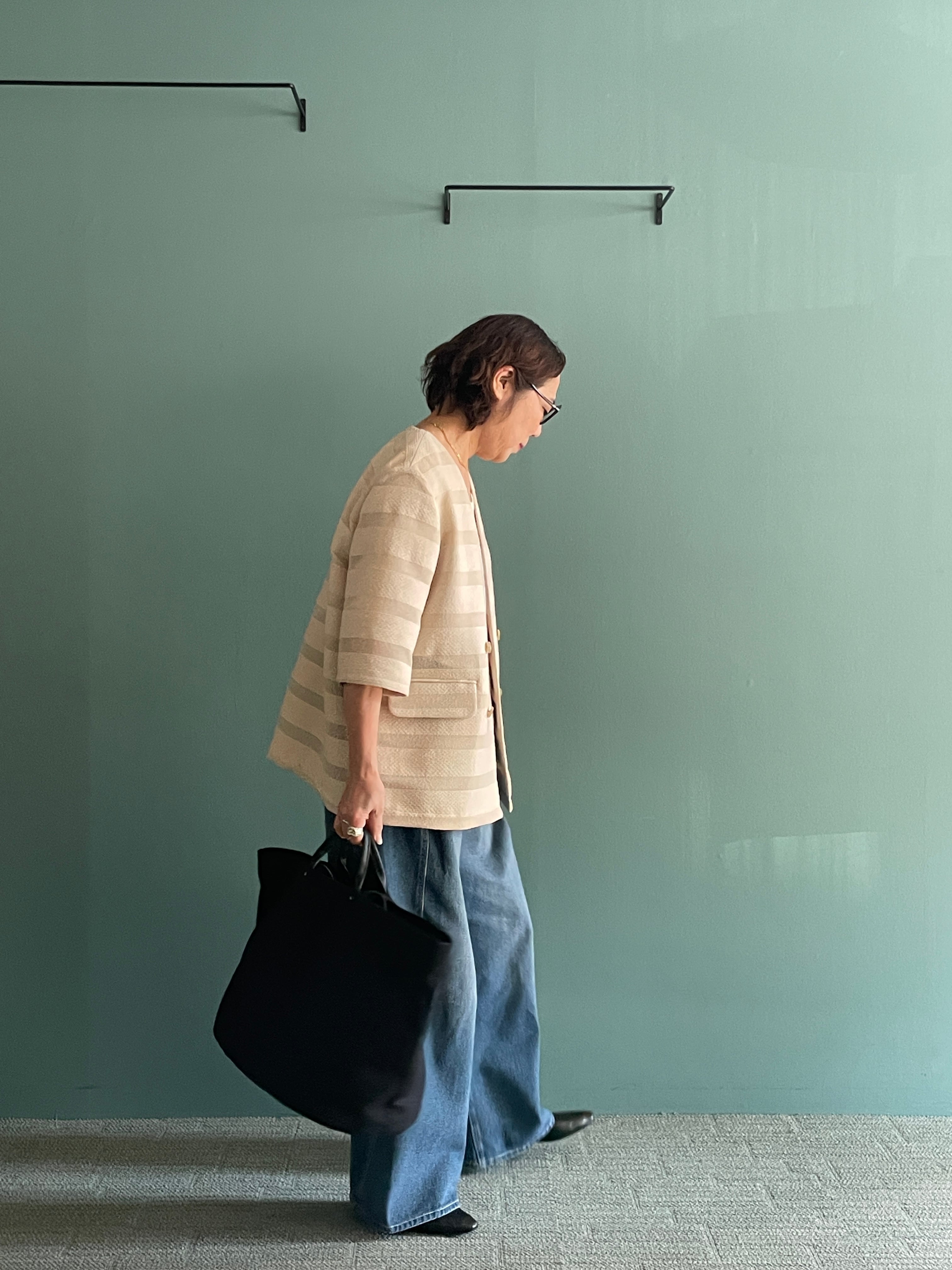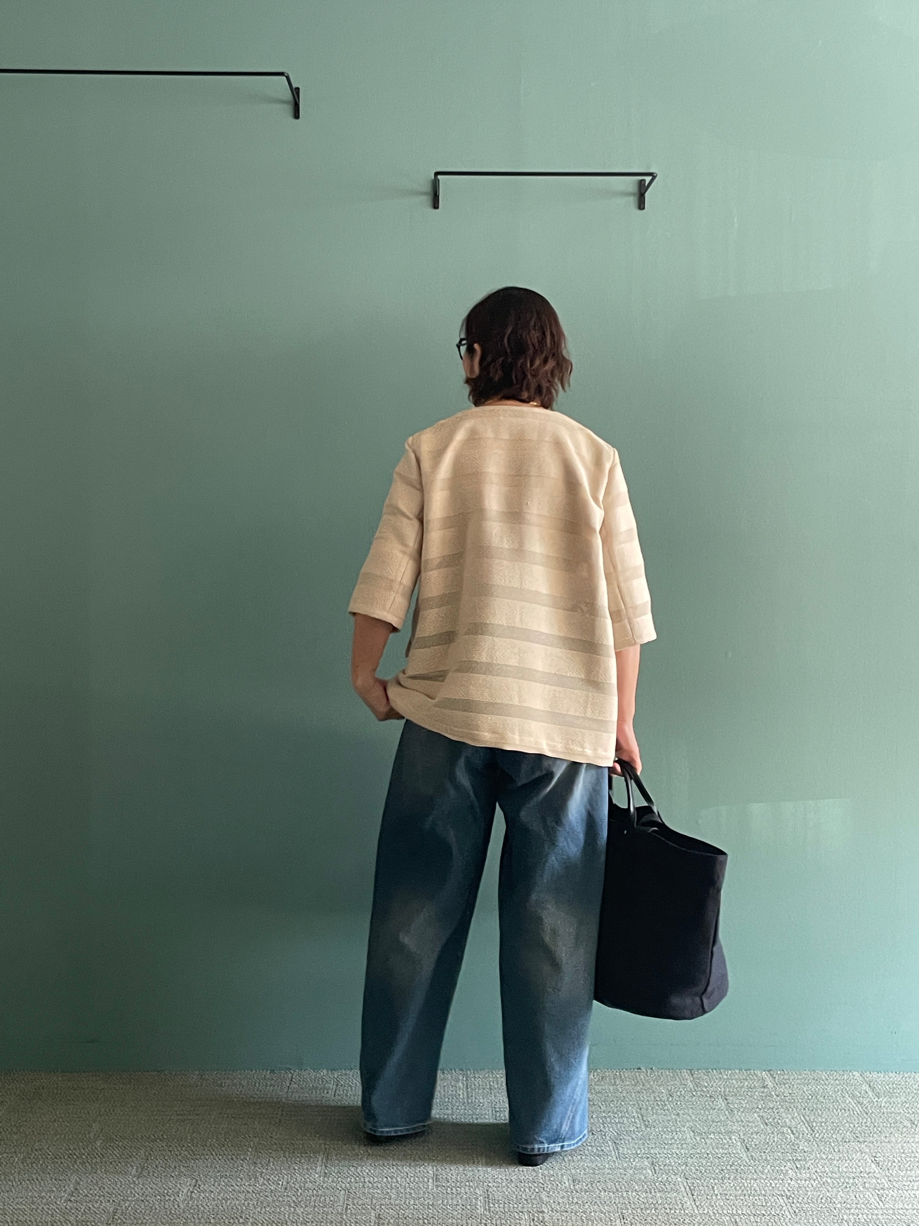 カラミ素材とツィード調素材を交互に織り重ねることで、光を透かし影を刻むようなボーダー柄を描いたノーカラージャケット。