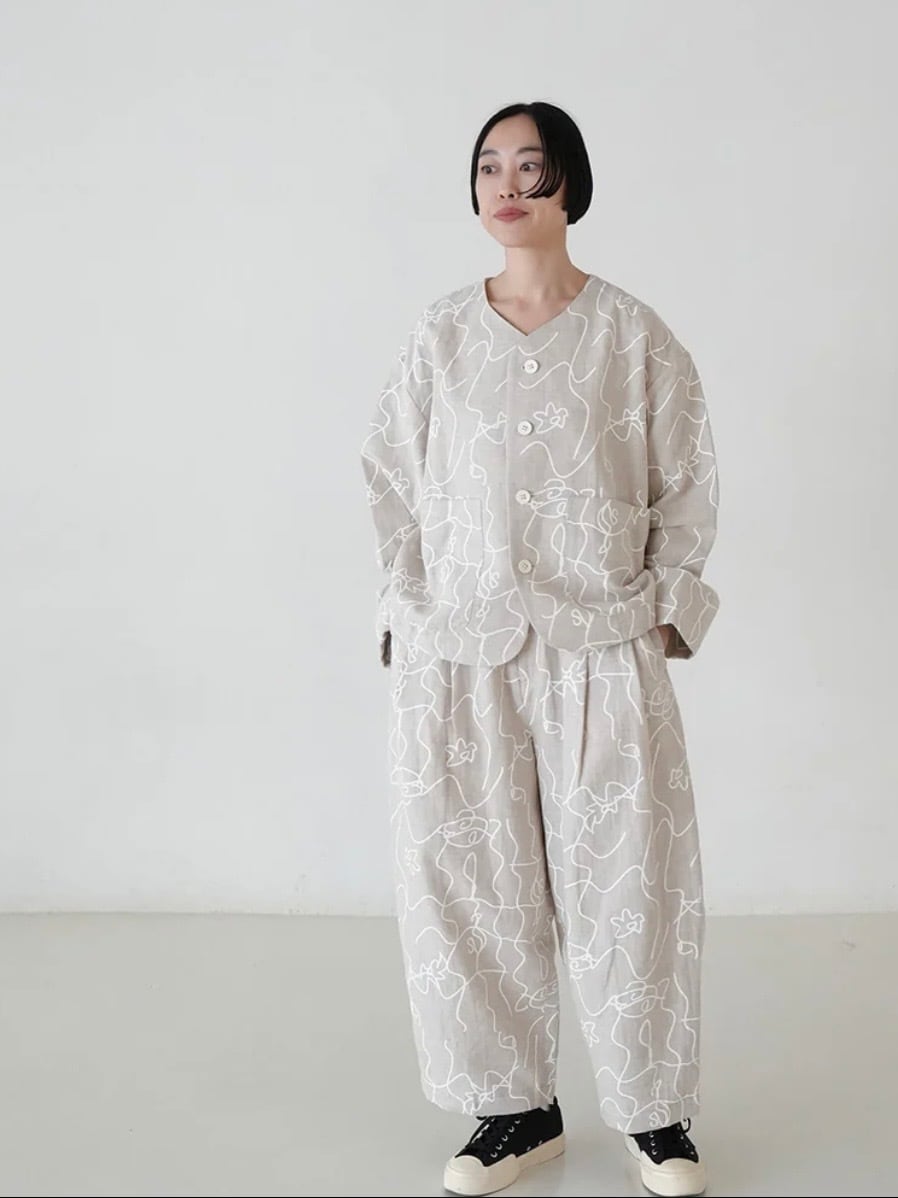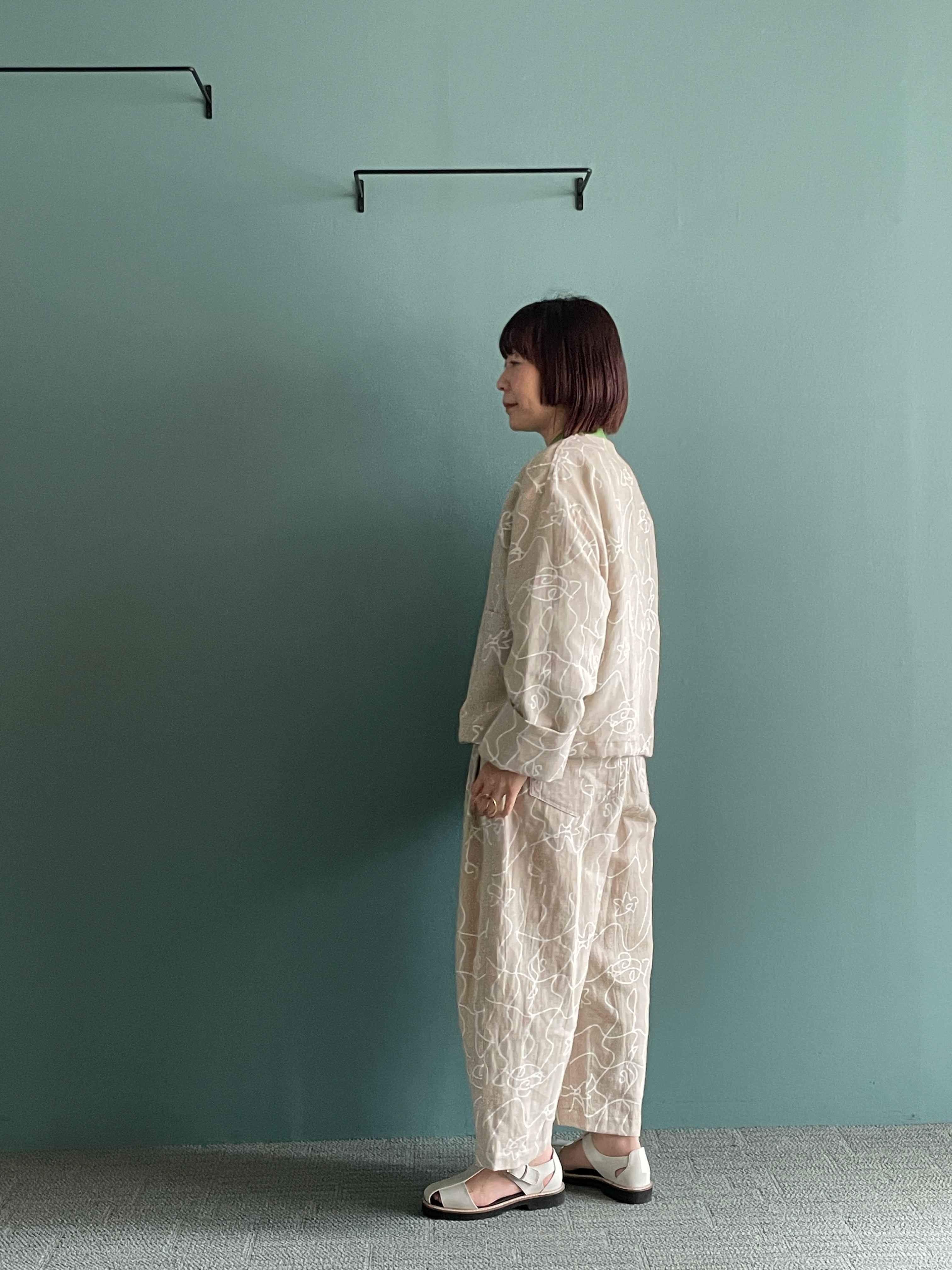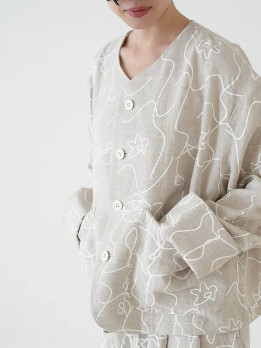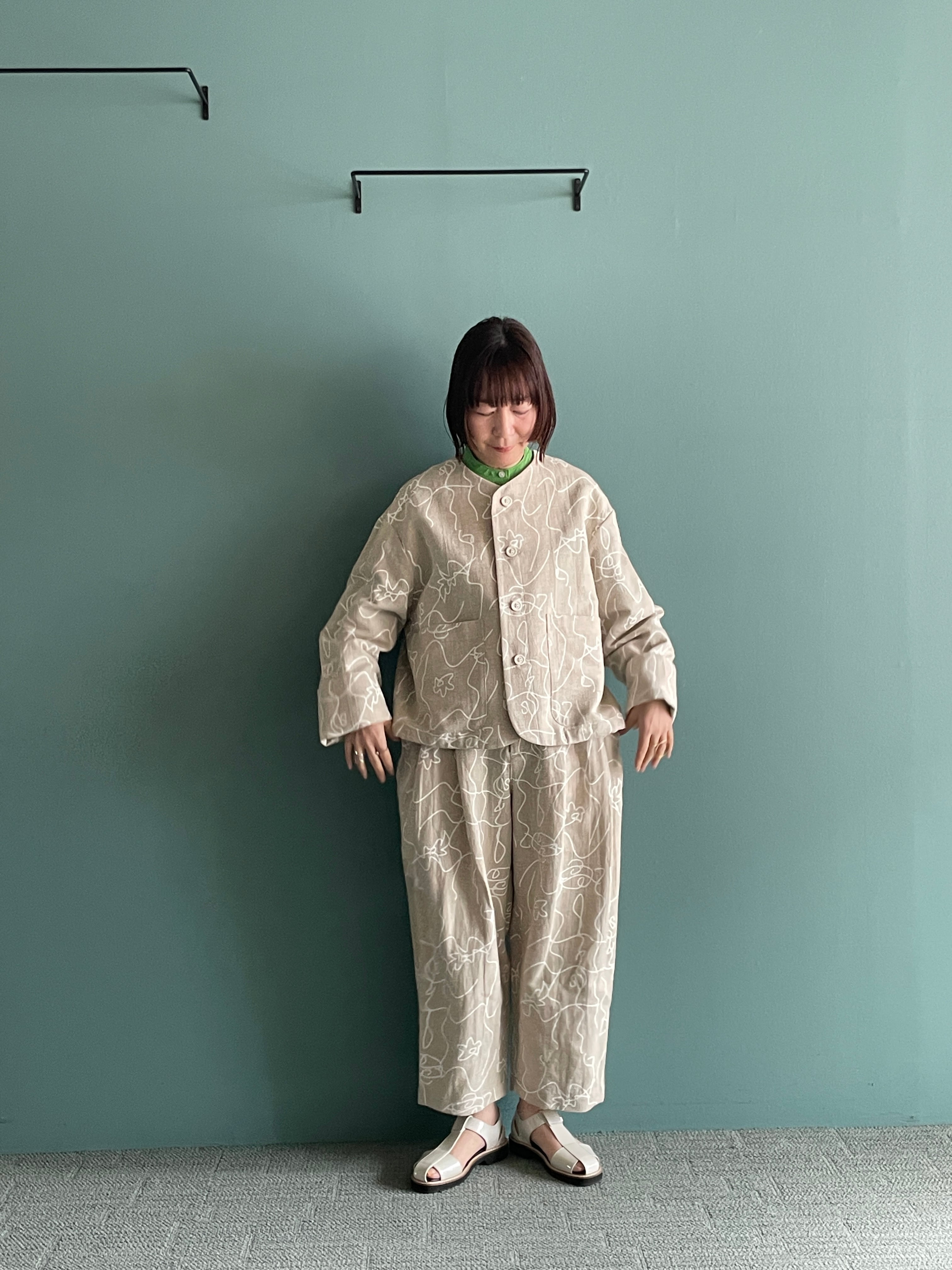 カジュアル感を持たせつつ、綿麻素材のオリジナルプリントが軽やかで表情豊かに仕上げています。