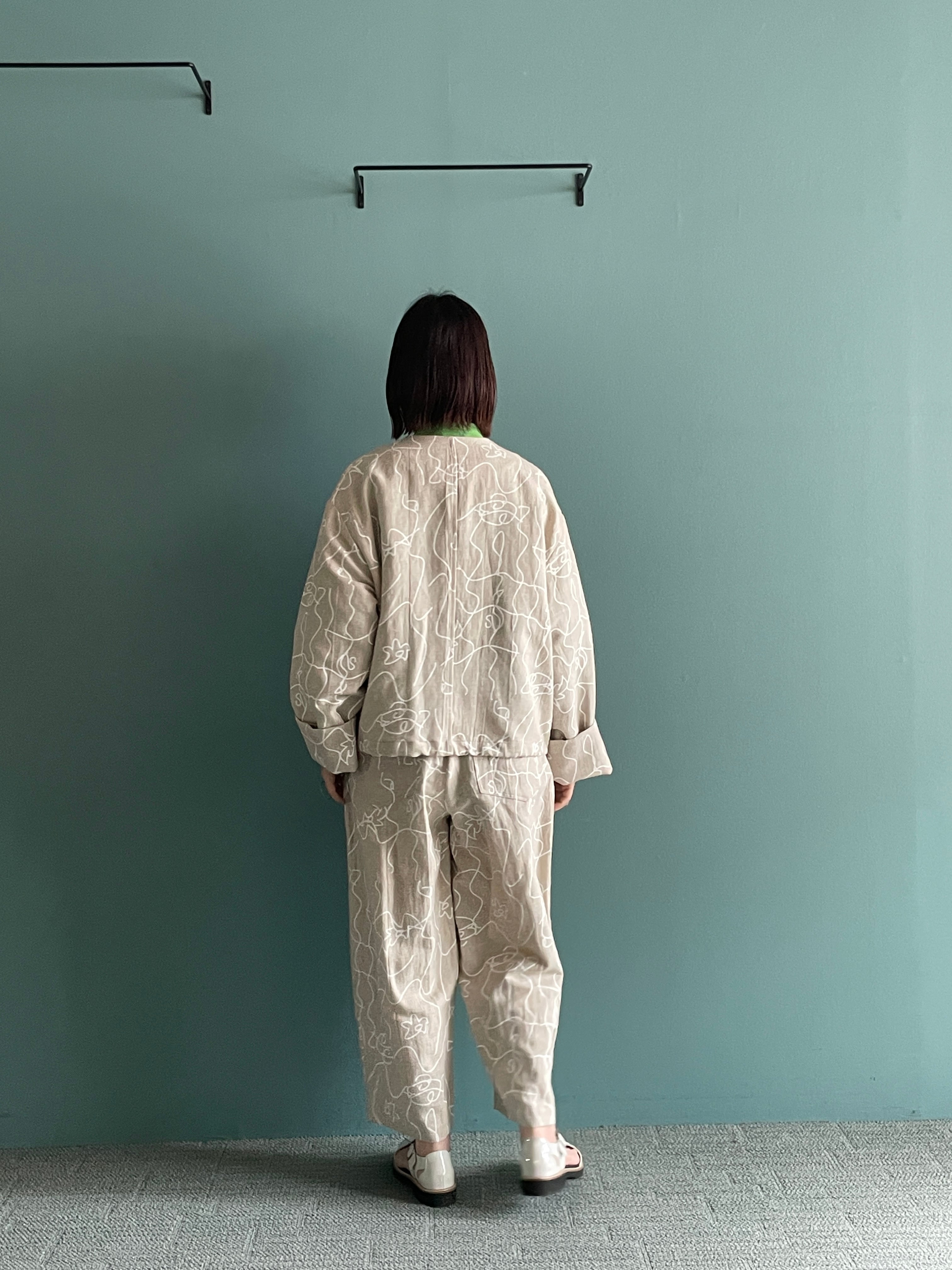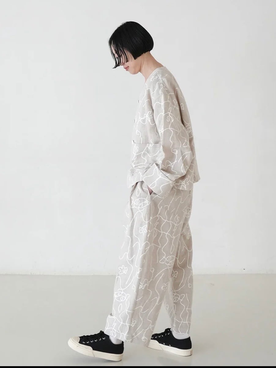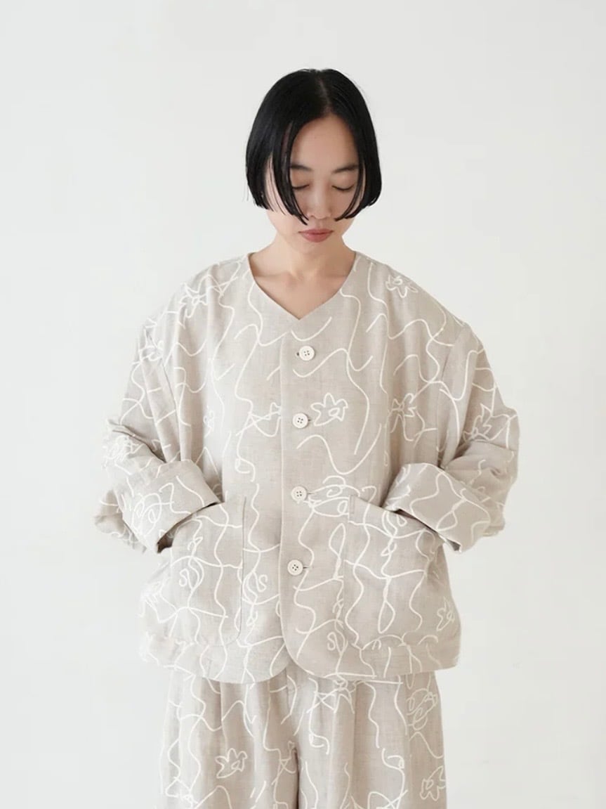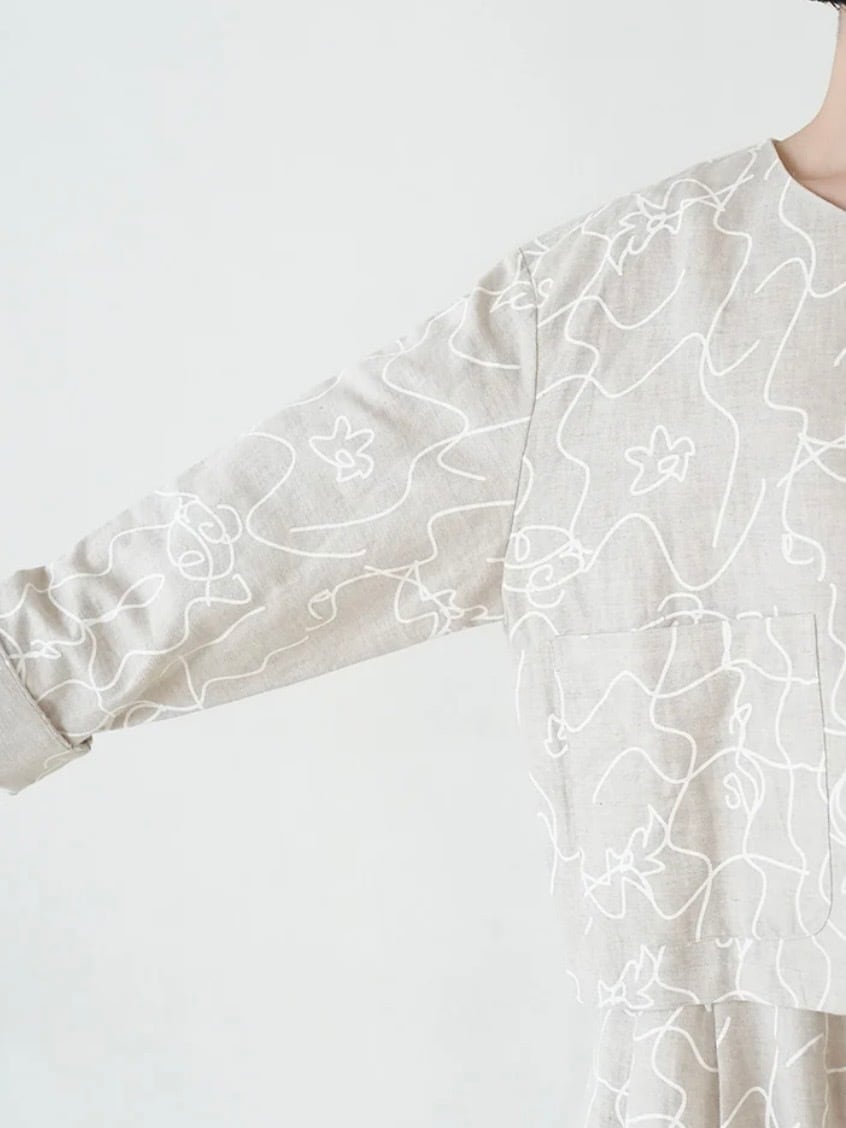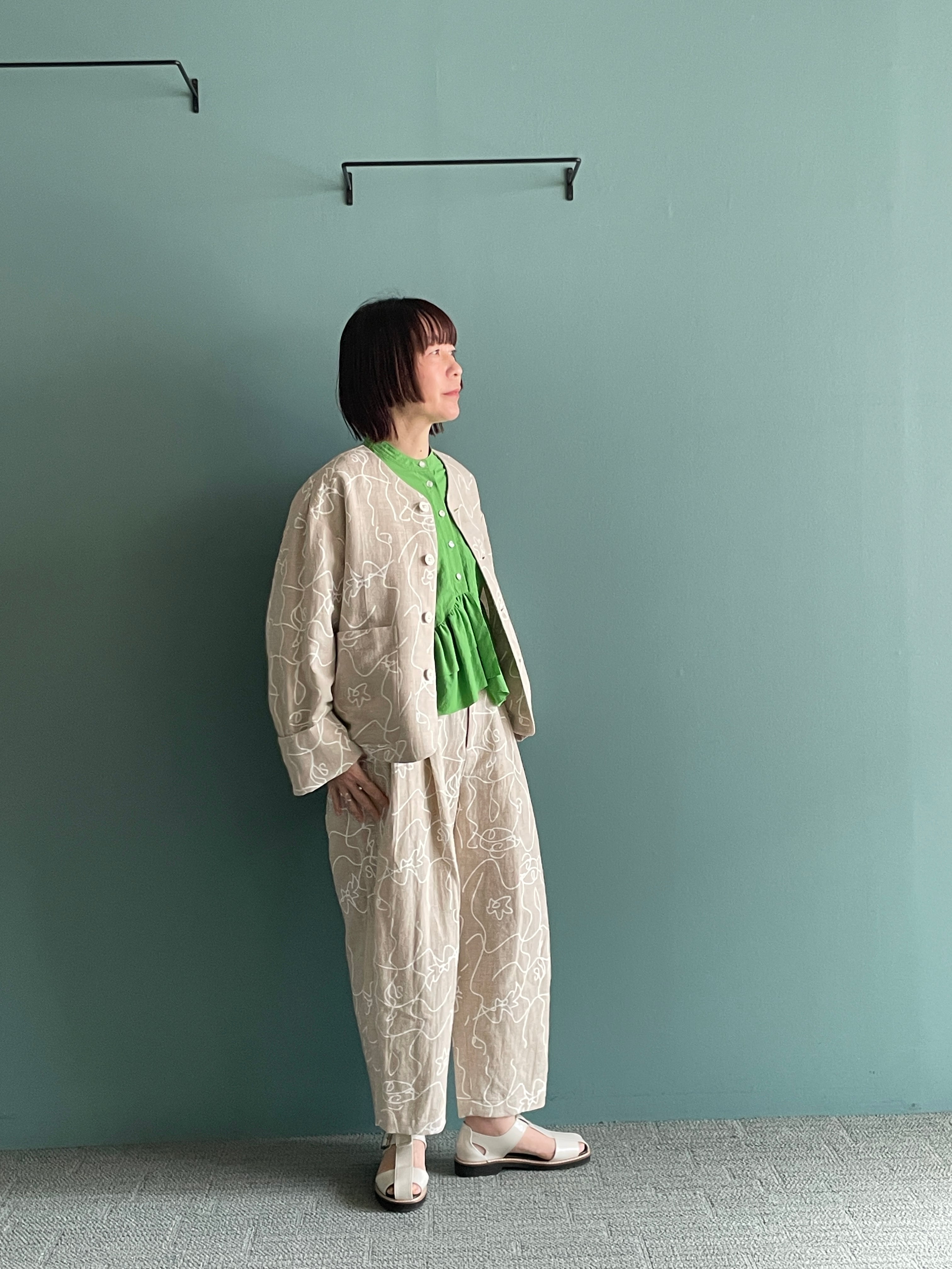 カジュアル感を持たせつつ、綿麻素材のオリジナルプリントが軽やかで表情豊かに仕上げています。