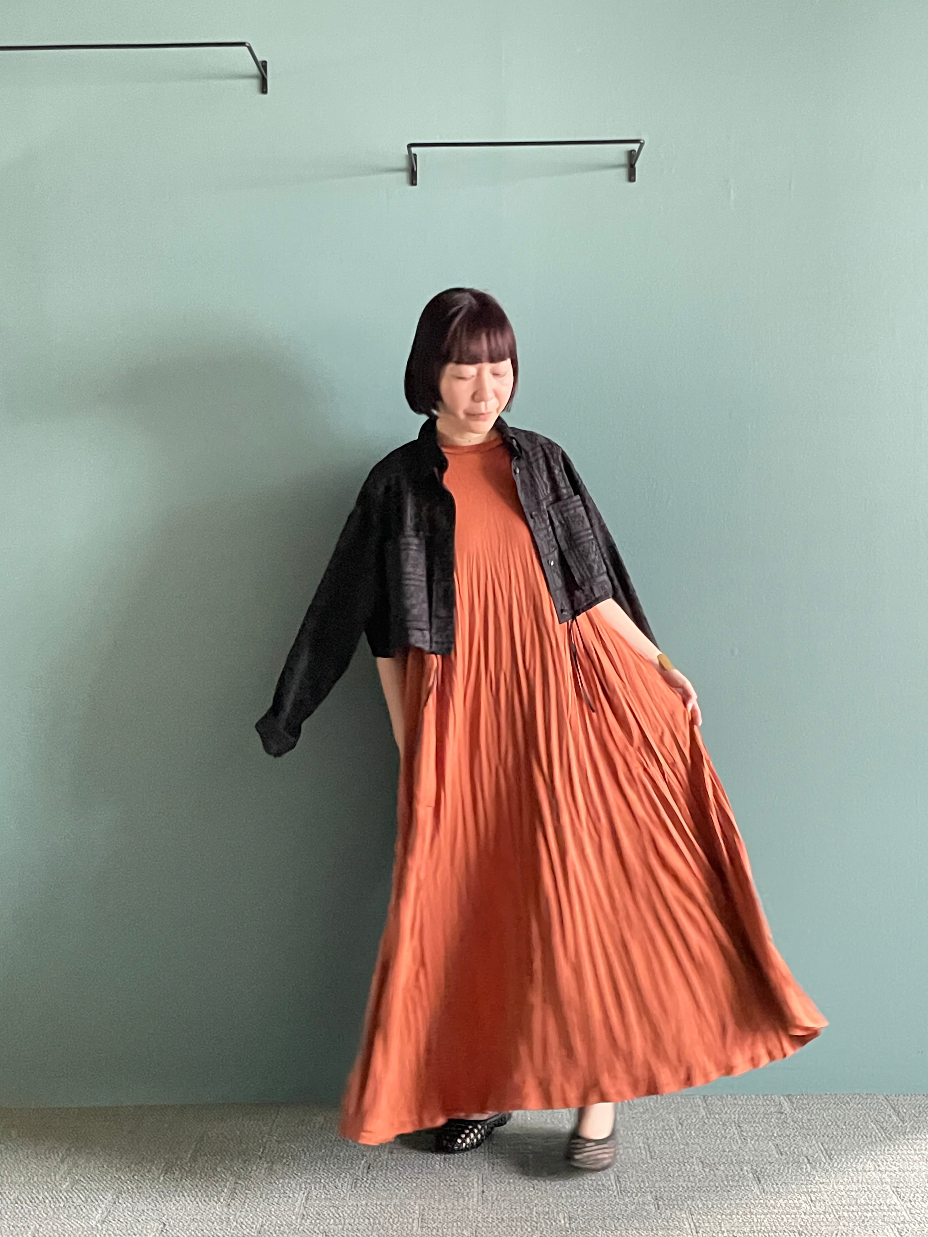 ストンと落ちたカットソー素材のプリーツワンピースは綺麗めな着こなしに。